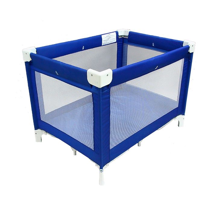 Institutional quality play yard made with a sturdy frame and padded top rails in a beautiful royal blue fabric.