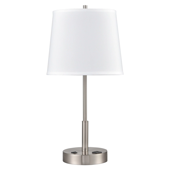 24.5″H Table lamp with brushed nickel finish and one convenience outlet
